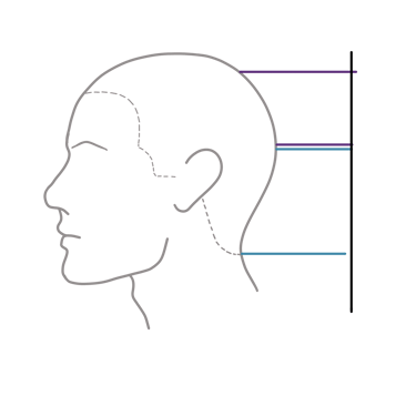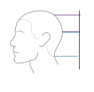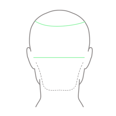 Para finalizar solo nos quedara el hemisferio posterior, trazaremos esta vez una linea recta que vaya desde un lado al otro de las orejas de forma horizontal. Tendremos entonces las seis particiones necesarias para este corte.
