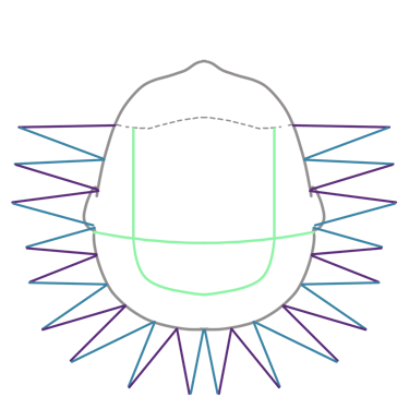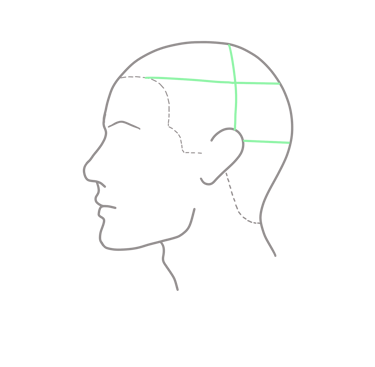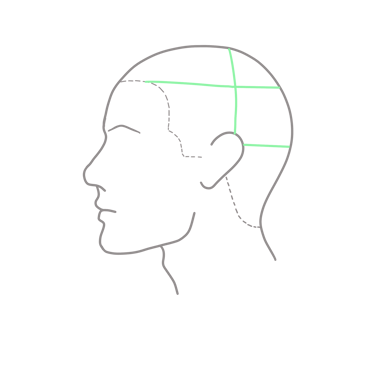Para comenzar debemos dividir los dos hemisferios, posterior y anterior, para ello lo que haremos es crear una linea recta que conecte desde una oreja hasta la otra pasando por el punto más alto del craneo. Posteriormente tomaremos dos lineas horizontales que discurran por la parte superior del puente de conexión, tendremos así tres particiones, la superior y las dos laterales.