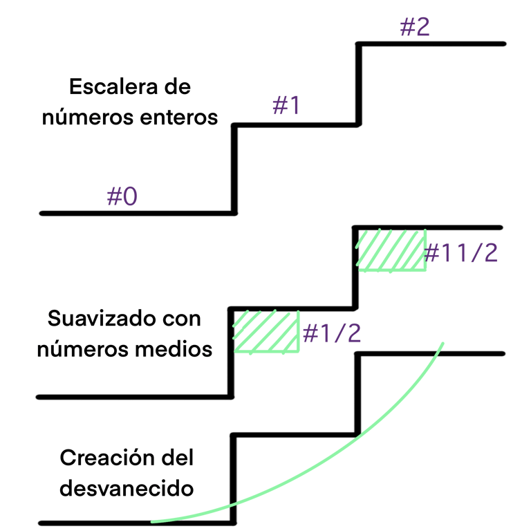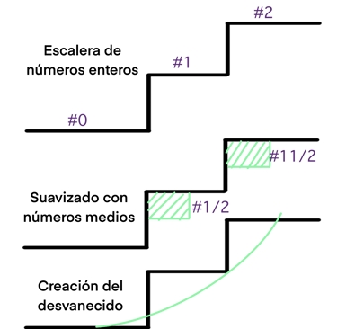 Posteriormente, una vez tengamos definida la escalera, continuaremos pasando los números medios, #1/2 y el #1 1/2 cada número servirá para conectar los enteros, es decir, el #1/2 se pasará en la línea que hace de barrera entre el #0 y el #1 y el #1 1/2 se pasará en la línea que hace de barrera entre el #1 y el #2. De esta manera se genera, visualmente una especie de curva o rampa propia de un fade.