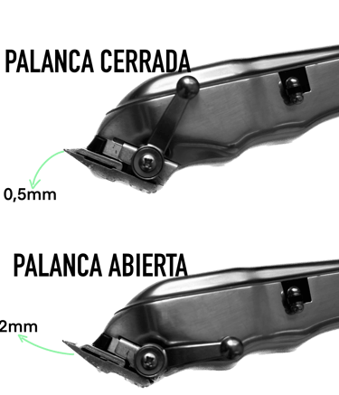 Cuando la palanca de ajuste esta hacia arriba, se dice palanca cerrada, es entonces cuando ambas cuchillas están posicionadas en el extremo para que el corte sea lo más corto posible, en el caso de la imagen sería 0,5 mm la longitud en la que quedaría el cabello.