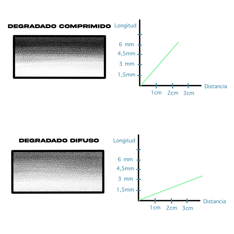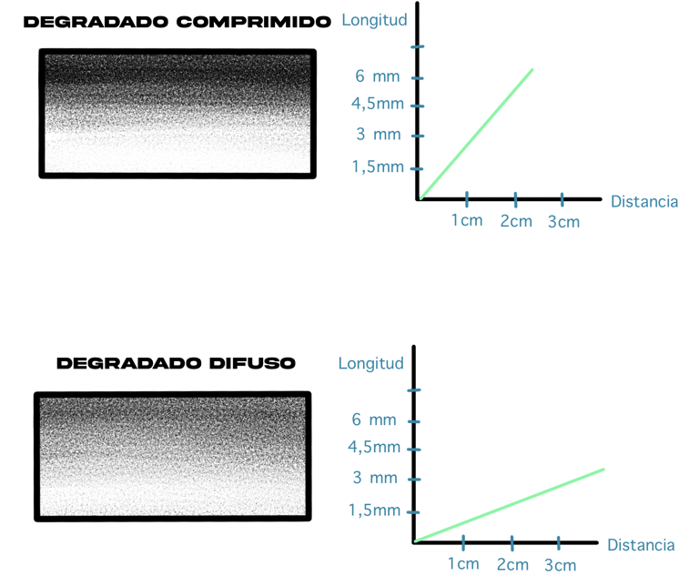 Técnicamente, la curva de progresión de las longitudes en un degradado difuso es menos inclinada con respecto a la curva de un degradado comprimido.