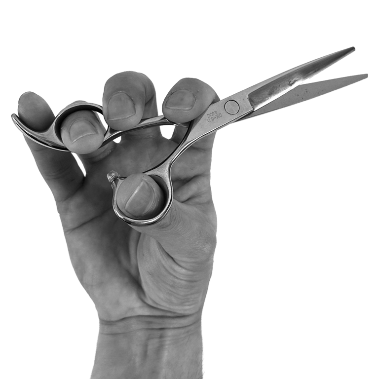 En primer lugar debemos colocar la palma de la mano hacia arriba e introducir el dedo anular por el agujero de la tijera que lleva la cola de estabilización, que es sobre la que apoyáremos el dedo meñique. A continuación introducimos el dedo pulgar en el otro agujero y giramos la mano, el resto de dedos nos ayudarán a mantener estable la tijera.